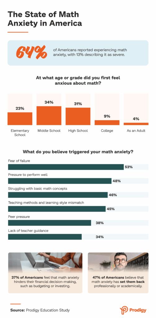 - Middle school is the most common time for math anxiety onset (34%).