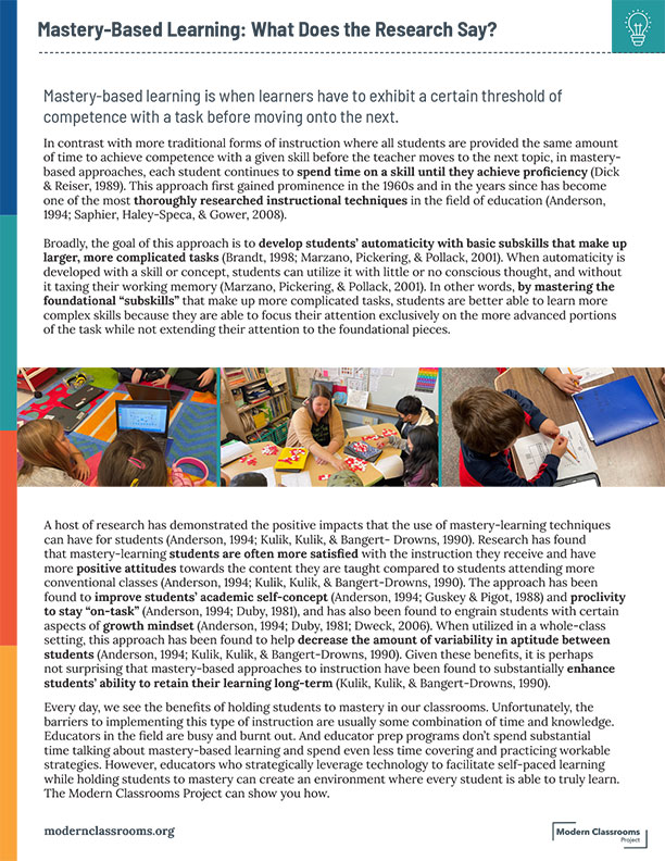 What does the research say about the effectiveness of mastery-based instruction? Download this research brief to see what studies have shown, and learn how educators are overcoming the most common barriers to implementing this type of learning in schools and districts. By submitting your contact information you are agreeing to receive communications from Modern Classrooms. Please read the Modern Classrooms Privacy Policy for more details.