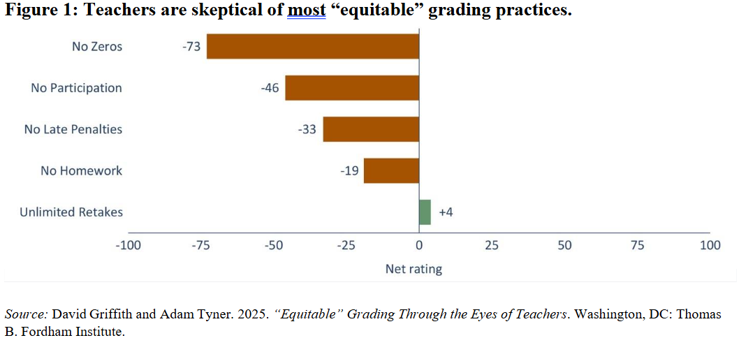 In fact, the only “equitable” grading policy with a positive rating is “unlimited retakes”—and even here, many teachers are skeptical.